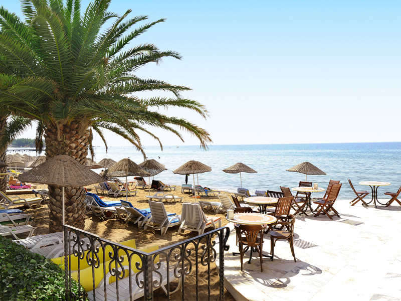 Die Lage spricht für kurze Wege: Das Haus steht direkt am Kies- und Sandstrand von Gümüldür‑Özdere. Zur Ortschaft sind es etwa 1 km, das Zentrum von Kusadasi liegt rund 40 km entfernt. Vor dem Hotel halten Minibusse, so erreicht Ihr umliegende Ziele ohne eigenes Auto. Der Strand ist laut Daten 100 m entfernt, praktisch vor Eurer Liege mit bereitgestellten Badetüchern. Highlight: Direkte Strandlage mit Minibus‑Anbindung und kurzer Distanz zur Ortschaft.