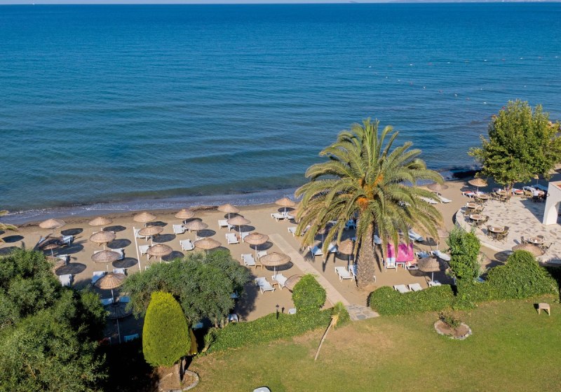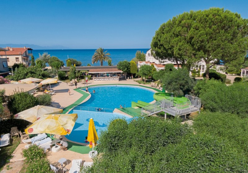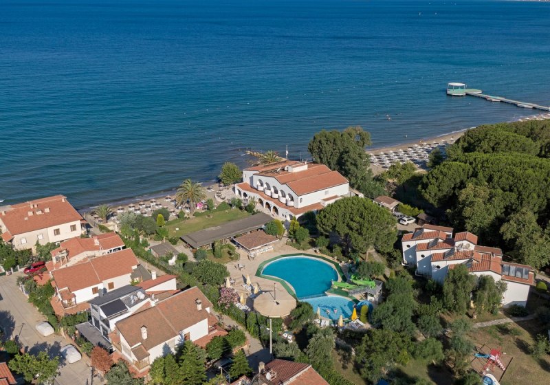 Die Anlage umfasst 70 Zimmer in fünf Gebäuden mit zwei bis drei Etagen, verbunden durch Gartenwege und Sonnenterrassen. Im Zentrum liegen Süßwasserpool, integriertes Kinderbecken und die Kinderrutsche. Am Pool und am Strand nutzt Ihr Liegen, Sonnenschirme und Badetücher ohne Aufpreis. WLAN steht in den öffentlichen Bereichen inklusive zur Verfügung. Highlight: Kompakte Wege mit klarer Struktur rund um den Poolbereich.