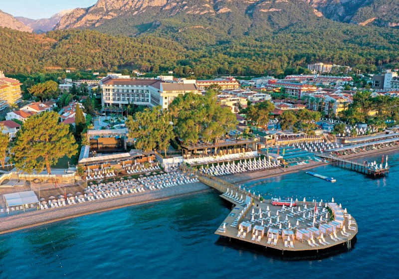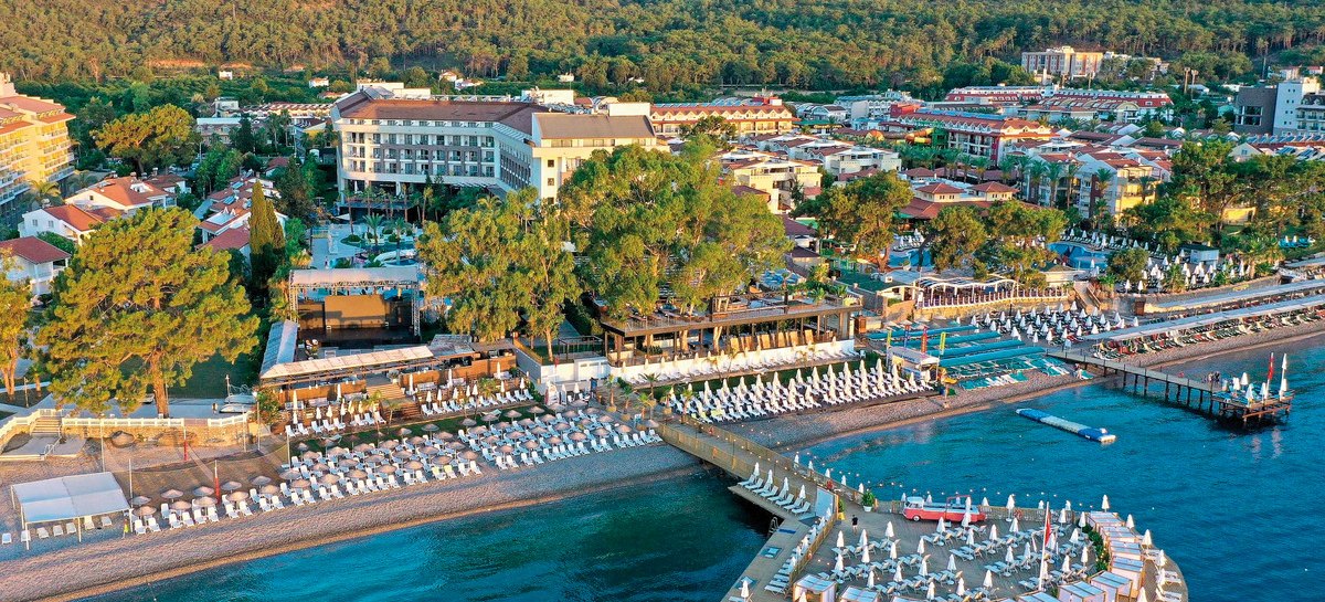 Ihr wohnt in Kemer, etwa 500 Meter vom Zentrum entfernt und rund 57 Kilometer vom Flughafen Antalya. Das Resort liegt an der Hauptstraße und direkt am Strand, inklusive eigenem Abschnitt und Steg. Einkaufsmöglichkeiten erreicht Ihr nach rund 700 Metern, das Touristenzentrum nach etwa einem Kilometer, die Marina Kemer liegt ungefähr drei Kilometer entfernt.