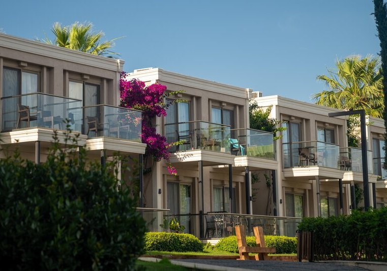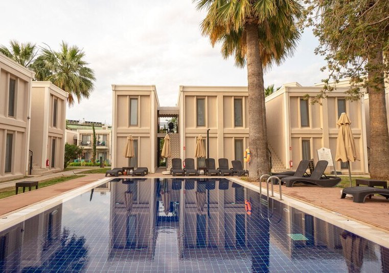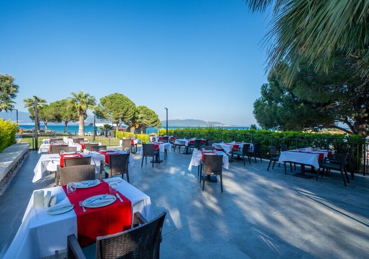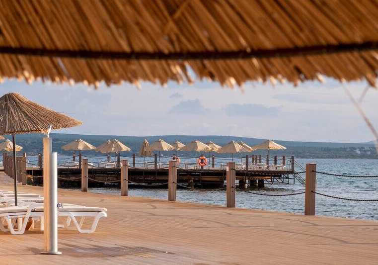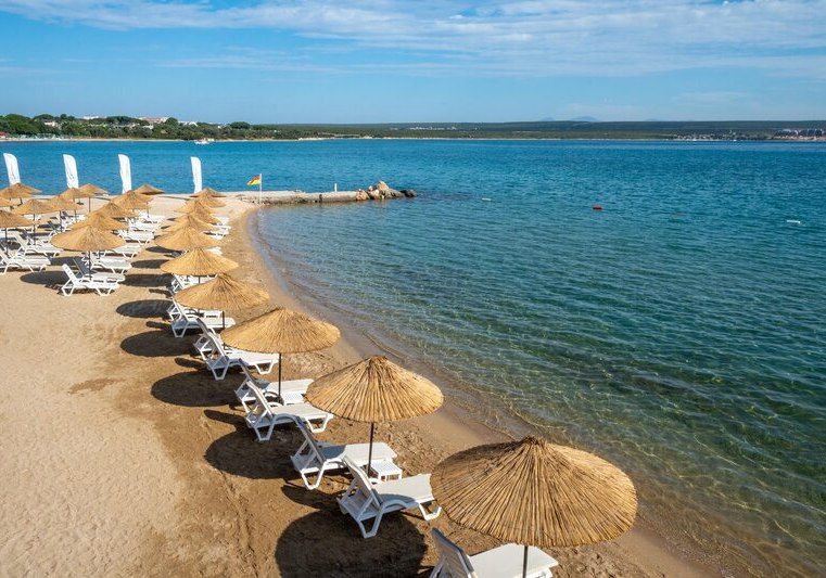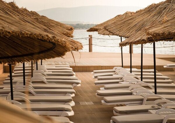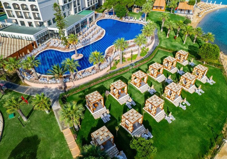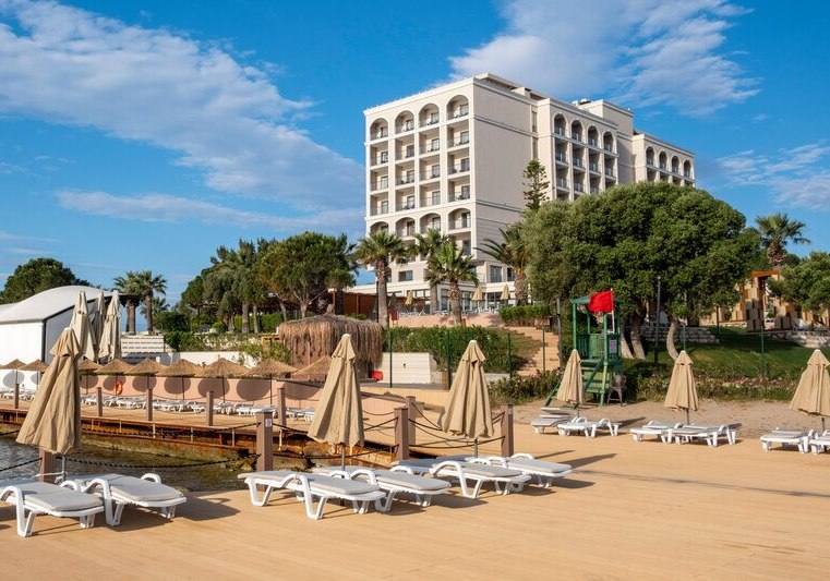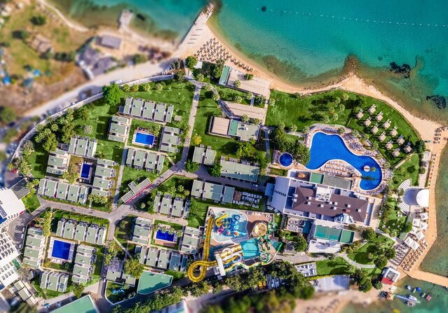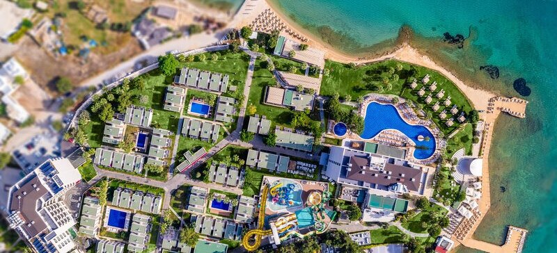 Die Lage ist klar definiert: Ihr wohnt direkt am hoteleigenen Sand-/Kiesstrand, während das Zentrum von Didim etwa 5 km entfernt liegt. Eine öffentliche Minibusverbindung und Taxis befinden sich in Hotelnähe, sodass Ihr flexibel zwischen Strandtag und Abstecher in die Stadt wechselt. Der Flughafen Bodrum ist mit rund 70 km gut eingeordnet. Auf dem Gelände akzentuieren Strandpavillons die Küstenlinie, während die Anlage selbst zwischen Hauptgebäuden und Bungalows strukturiert ist. So erlebt Ihr eine Mischung aus unmittelbarer Strandnähe und praktischer Anbindung für kurze Wege in die Umgebung. Highlight: Direkte Strandlage mit schneller Anbindung nach Didim.