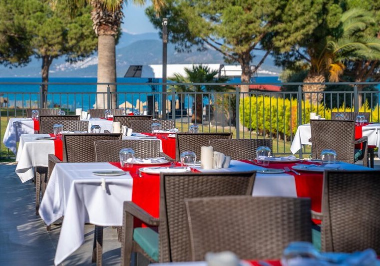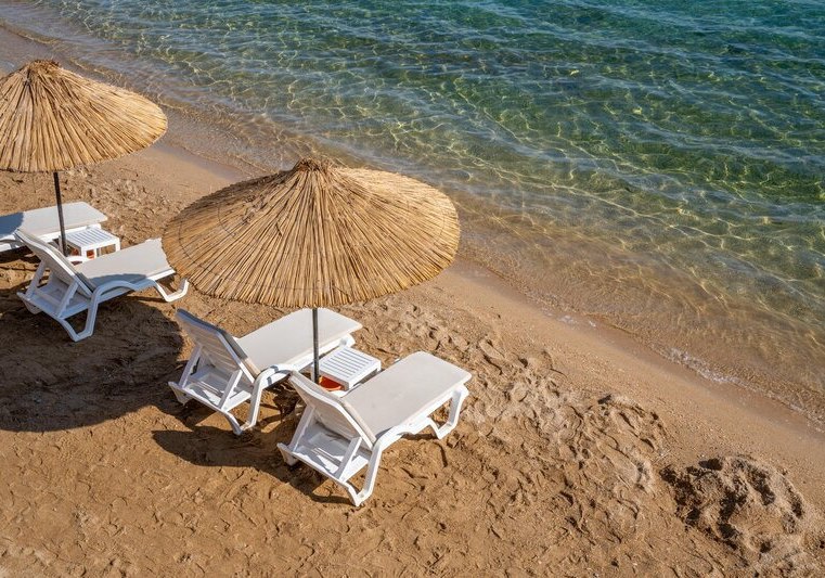 - Direkt am Strand: Privater Sand-/Kiesstrand mit Liegen und Schirmen am Hotel.