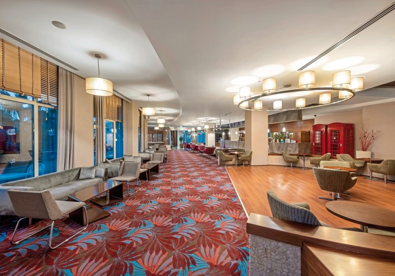 Das Resort umfasst 292 Zimmer in vier Gebäuden mit Aufzügen. Die Empfangshalle mit Rezeption wirkt als klarer Ankerpunkt. Wi‑Fi erreicht alle Bereiche inklusive Strand. Draußen liegen Süßwasser‑Pool, Sonnenterrasse und ein separater Kinderpool. Der Rutschenpool mit fünf Bahnen bringt Bewegung ins Wasserbild. Highlight: Fünf Wasserrutschen plus separater Kinderbereich.