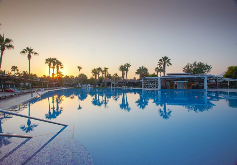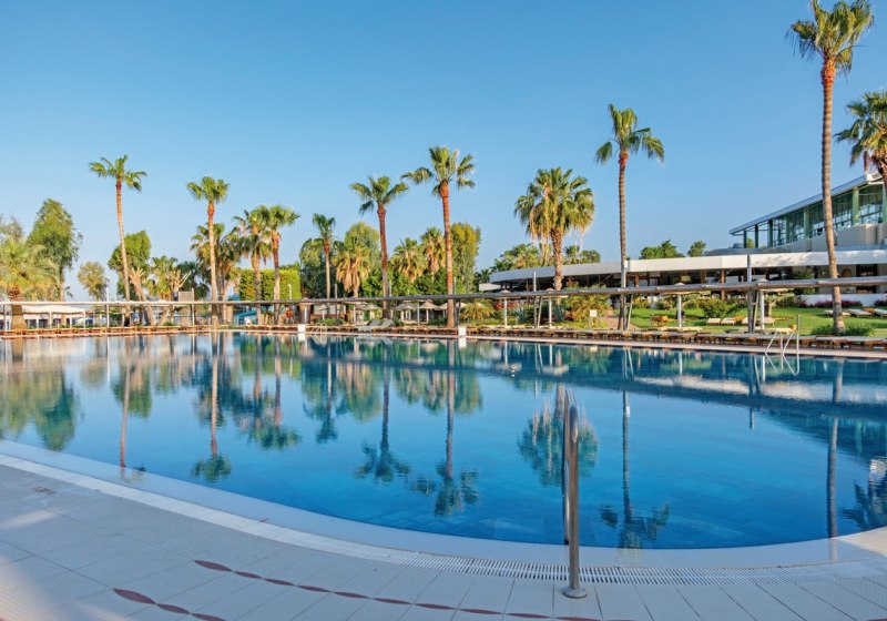 Im Außenbereich verteilen sich mehrere Pools, eine großzügige Sonnenterrasse und ein Wasserpark mit Rutschen. Liegen, Sonnenschirme und Badetücher sind an Pool und Strand vorgesehen. Spielplatz und Mini-Zoo setzen familienfreundliche Akzente, Swim-up- und Poolbar sorgen für kurze Wege. Zusatzservices von Wäscherei über Arzt bis Transferservice halten den Ablauf reibungslos.
