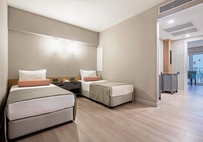 Zur Ausstattung zählen Dusche, Bademantel, Haartrockner, Laminatboden, zentrale Klimaanlage, Minibar, Safe, Sat-TV sowie Wasserkocher mit Kaffee-/Tee-Set. Für Kleinkinder sind Babybetten vorgesehen. So entsteht ein klar strukturiertes Wohngefühl mit praktischen Details für Paare, Familien und längere Aufenthalte.