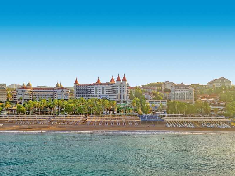 Arycanda Kirman Premium empfängt Euch direkt am Sand- und Kiesstrand von Karaburun mit einer weitläufigen Anlage, in der Ihr Euch schnell orientiert. 360 Zimmer verteilen sich auf fünf Etagen, verbunden durch vier Panoramaaufzüge. In der großzügigen Lobby mit Sitzecken nutzt Ihr WLAN und trefft Euch entspannt vor dem Abendprogramm. Familien, Strandreisende und Hochzeitsreisende finden dank Miniclub, Kinderbecken und direktem Strandzugang passende Rahmenbedingungen. Highlight: Direkte Strandlage mit kurzer Wegeführung zwischen Lobby, Poolbereich und Strandzugang.