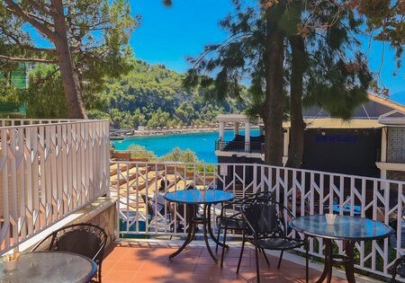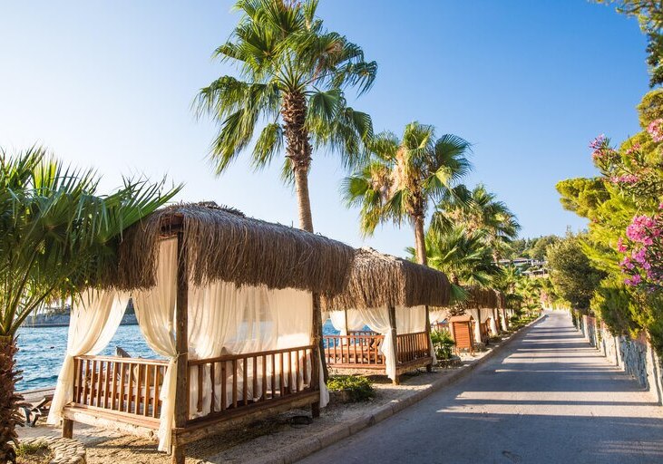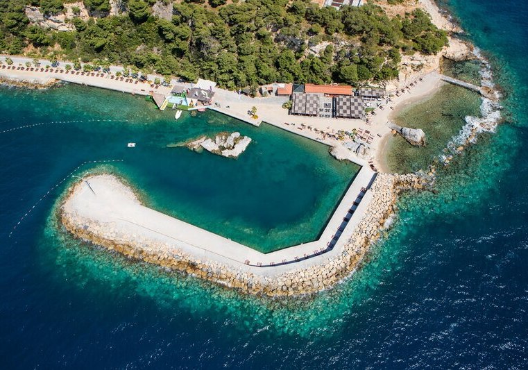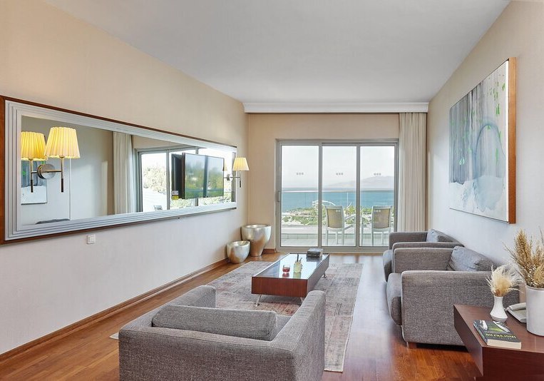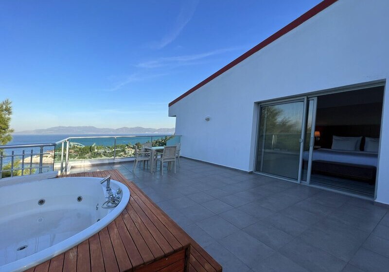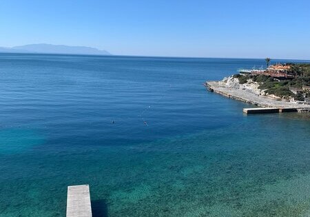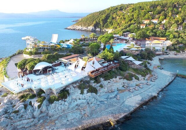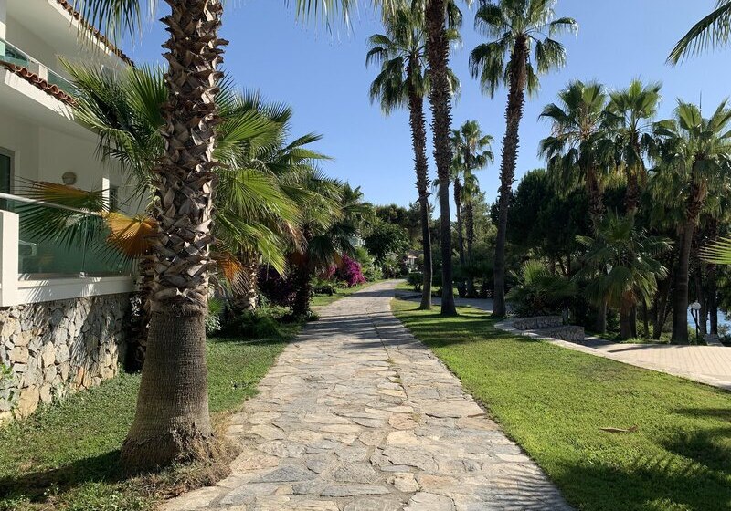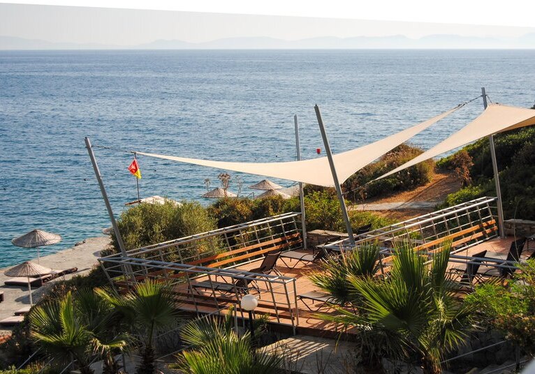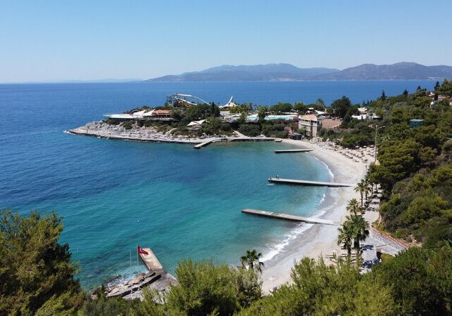 Ihr wohnt direkt an der hoteleigenen Badebucht mit grobem Sand-Kiesstrand und Badeplattform. Bis ins Zentrum von Kusadasi sind es etwa 5 Kilometer; die Altstadt liegt rund 10 Kilometer entfernt. Bushaltestelle und ÖPNV erreicht Ihr zu Fuß in etwa zwei Minuten, ebenso Meer, Marina und der Strandabschnitt „Pine Bay Holiday Resort“.