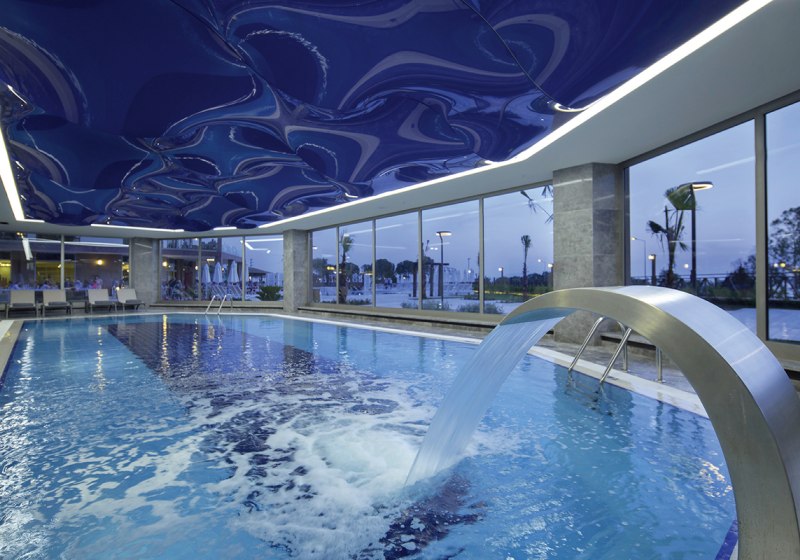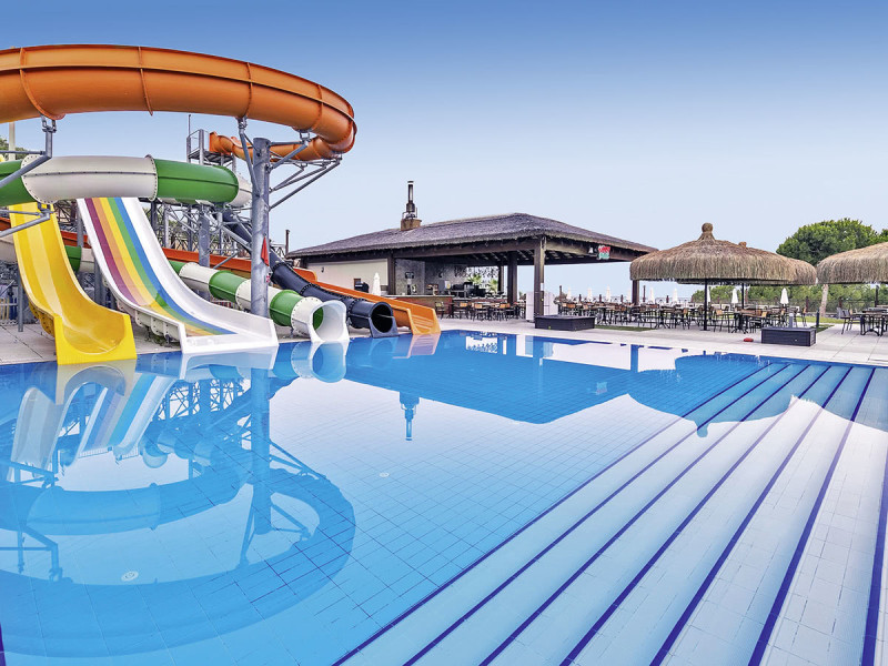 • Liegestühle • Hallenbad • Außenpool • Sonnenschirme • Poolbar • Sonnenterrasse • Wasserpark • Pool • Badetücher • Wasserrutsche