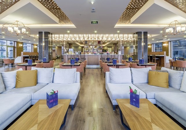 Im Ramada Resort by Wyndham Kusadasi wohnt Ihr in einem 5-Sterne-Resort, das Eure Tage strukturiert und leicht macht: morgens ein schneller Kaffee in der Lobbybar, später ein Sprung in den Pool oder hinunter per Shuttle an den privaten Sand-/Kiesstrand. Die Anlage ist so angelegt, dass Ihr zwischen Aktivität und Ruhe elegant wechselt – mit großzügigen Außenbereichen, einer Sonnenterrasse und Rückzugsorten wie Bibliothek oder TV-Raum. Familien finden klare Angebote für verschiedene Altersgruppen, während Paare die langen Abende zwischen Bars und Theatersaal genießen.