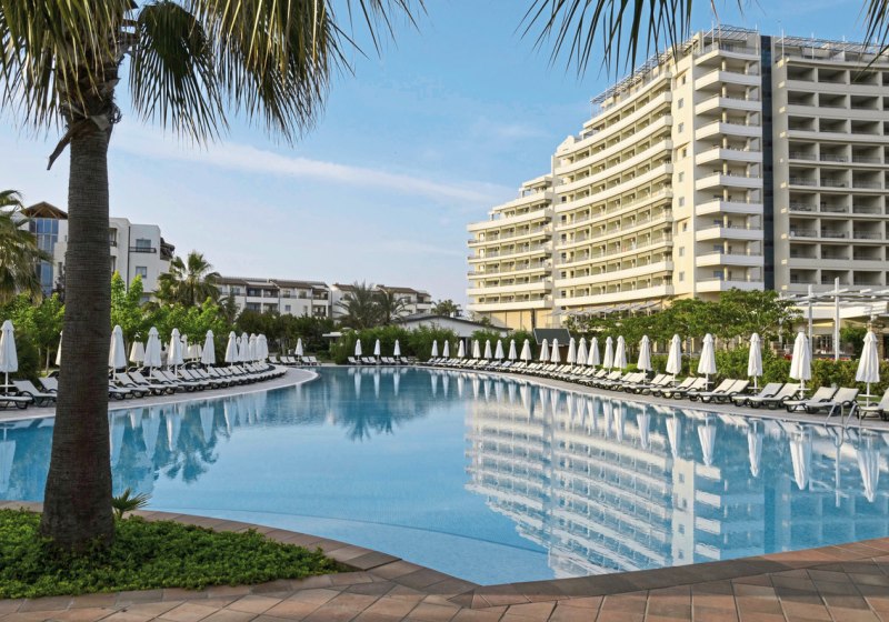 In Lara Barut Collection wohnt Ihr direkt am Kies‑/Sandstrand von Lara, mit Antalya in greifbarer Nähe. Das Haus verbindet großzügige Außenbereiche mit sieben Pools und einem Aquapark samt markanter King‑Kobra‑Rutsche. Die Atmosphäre wirkt lebhaft und zugleich strukturiert, getragen von klaren Abläufen, breiten Wegen und vielen Rückzugsplätzen im Garten und auf Sonnenterrassen.