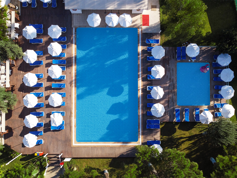 • Liegestühle • Außenpool • Sonnenschirme • Pool • Poolbar • Sonnenterrasse • Dachterrasse (unüberdacht, eingeschränkte Nutzungsdauer pro Gast) • Badetücher