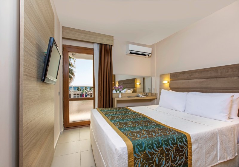 - Klar eingerichtet: 20-m²-Doppelzimmer mit Balkon, AC, LCD-Sat-TV und Minibar.