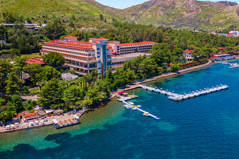 Das Labranda Mares Marmaris ist ein ansprechendes, familienfreundliches 5-Sterne-Hotel im mediterranen Stil, das für einen erholsamen Urlaub an der türkischen Ägäisküste ideal ist. Die Anlage liegt idyllisch am Waldrand, in Hanglage, nahe der malerischen Bucht von Marmaris und am Stadtrand. Das Hotel umfasst ein Hauptgebäude mit vier Etagen, 159 Bungalows und insgesamt 441 Zimmer/Wohneinheiten. Die Außenanlage ist gepflegt und bietet eine Sonnenterrasse, zwei Swimmingpools, eine Diskothek, diverse Geschäfte und einen Friseur. Zu den gastronomischen Einrichtungen gehören fünf Restaurants und sieben Bars. Ein Miniclub und diverse Sport- und Wellnessmöglichkeiten runden das Angebot ab.Bewertung