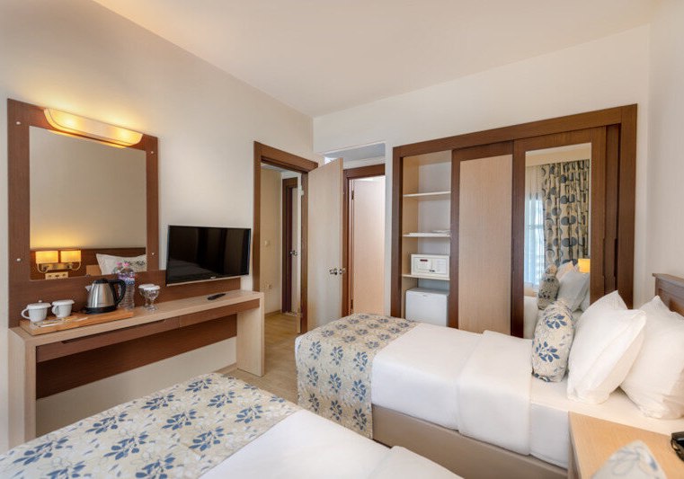 Zimmer• Klimaanlage (zentral) • Haartrockner • Minibar (gegen Gebühr) • Telefon (auf Anfrage) • Safe (kostenfrei) • Kaffee-/Teezubereiter • Fernseher • rollstuhlgerechte Zimmer (auf Anfrage) • WiFi (kostenfrei) • Balkon oder Terrasse • Buchtblick • Gartenblick (je nach gebuchter Leistung) • Essecke • Wasserkocher • Maximalbelegung (Kinder) (1)