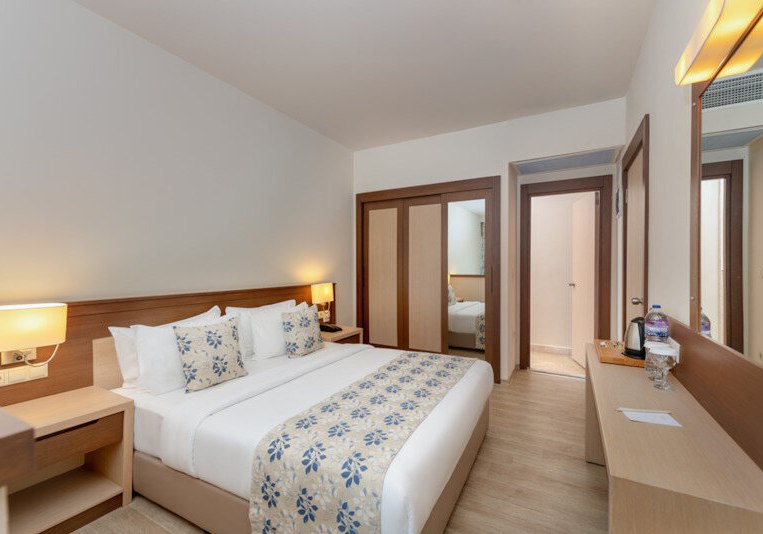 Ihr esst im Restaurant mit reichhaltigem Buffet; morgens erwartet Euch ein Frühstücksbuffet. Dazu kommen Café, Poolbar und Strandbar sowie insgesamt sechs Bars für Tages- und Abendstunden. All-Inclusive ist täglich von 10:00 bis 24:00 Uhr verfügbar und umfasst alkoholfreie und alkoholische Getränke, Snacks sowie die Hauptmahlzeiten.