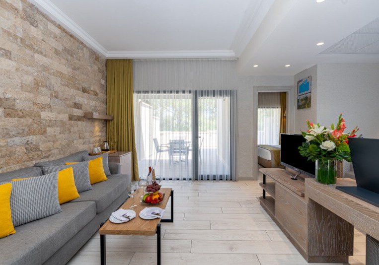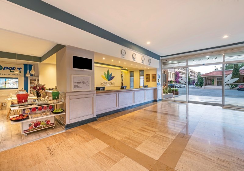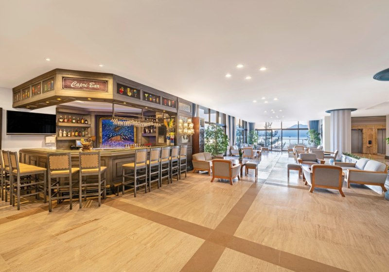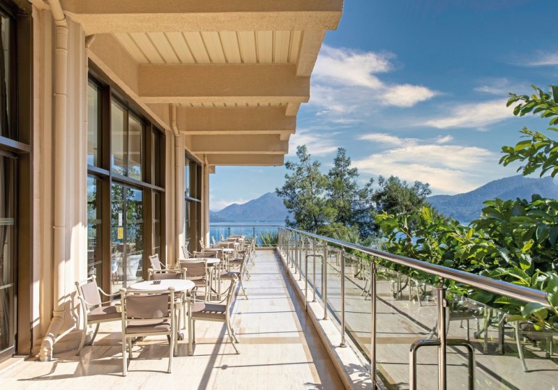 Labranda Mares Marmaris empfängt Euch in einer weitläufigen Ferienanlage mit Privatstrand aus Sand und Kies, eingebettet zwischen Gartenflächen, Terrassen und einem großen Außenpool mit Wasserrutsche. In der Lobby trefft Ihr auf 24-Stunden-Rezeption, WLAN und eine unaufgeregte, professionelle Atmosphäre. Die offizielle Kategorie ist 5, die Sprachen sind Deutsch und Englisch – das schafft Orientierung und unkomplizierten Service vom ersten Moment an.