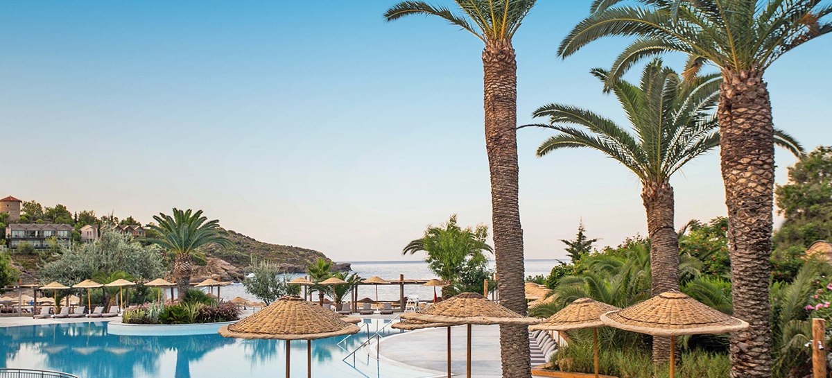 - Weitläufige Anlage: Gartenwege, Terrassen und Pools verbinden Strand und Aufenthaltsbereiche.