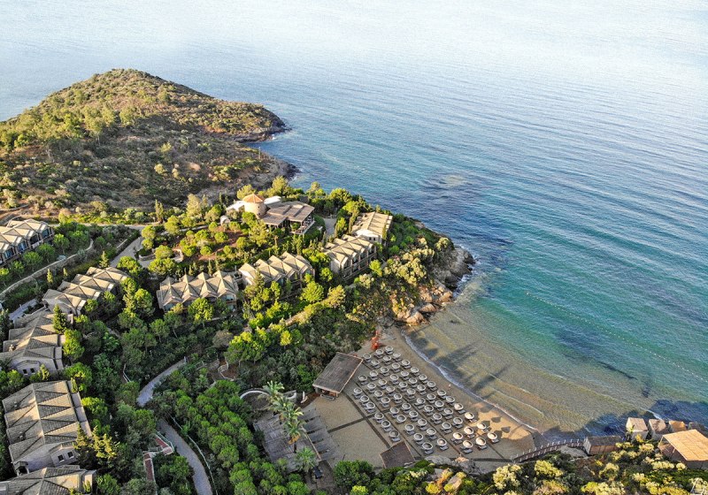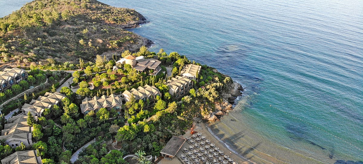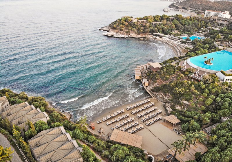 Die Lage verbindet ruhige Strandabschnitte mit lebendigem Clubleben am Ortsrand, umgeben von ländlicher Umgebung. Sonnenliegen, Sonnenschirme und Umkleidekabinen stehen an Strand und Pools bereit, zwei Strandbars versorgen Euch tagsüber. Eine Bushaltestelle (Grand Efe) befindet sich in etwa 100 m Entfernung, die ÖPNV-Anbindung ist nah. Highlight: Direkte Strandlage an zwei Buchten mit klar getrennten Zonen.