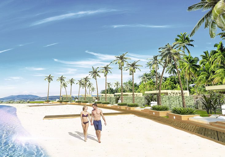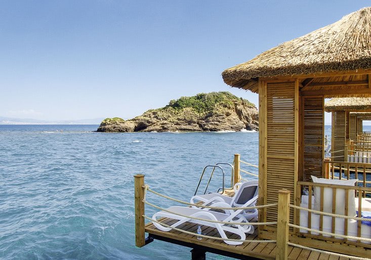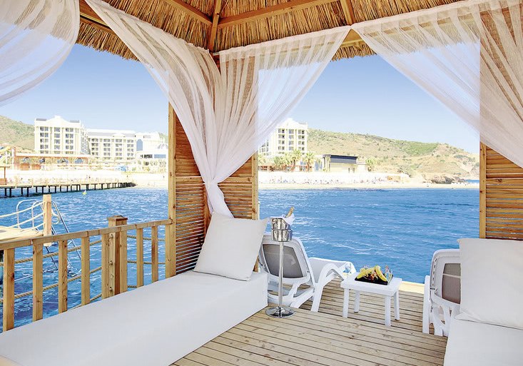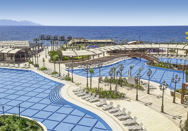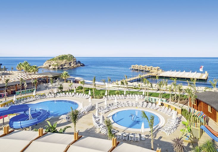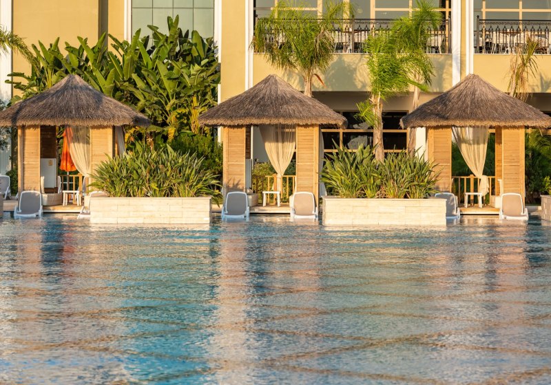 Zwei Süßwasserpools, ein Rutschenpool mit vier Bahnen und ein Kinderbecken mit drei Rutschen ordnen den Badetag. Am hoteleigenen Strandabschnitt warten Liegen, Sonnenschirme und Badetücher; der Badesteg erleichtert den Zugang ins Meer. Pavillons und eine breite Sonnenterrasse runden die Außenbereiche ab.