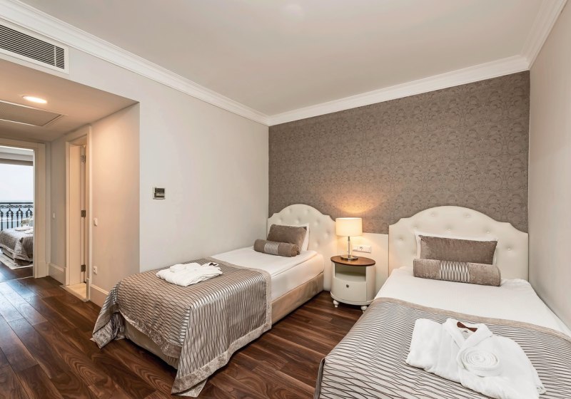 Für mehr Platz wählt Ihr Familienzimmer mit zwei Schlafzimmern oder Suiten mit Verbindungstür. Royal Doppelzimmer bieten ein separates Wohnzimmer, zwei Bäder mit Wanne und Dusche sowie Meerblick. Die Lagunen Doppelzimmer kombinieren zwei Schlafzimmer und Wohnzimmer mit zwei Bädern und Meerblick für strukturierte Familienzeit.