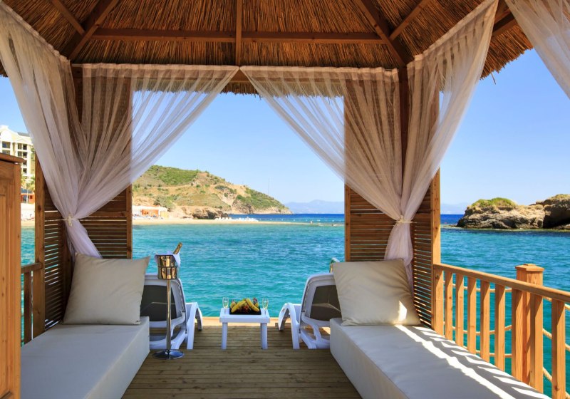 Ihr urlaubt in Özdere, direkt am eigenen Sand- und Kiesstrand mit Badesteg. Der Ort liegt etwa 3 Kilometer entfernt, öffentliche Minibusse und Taxis verkehren in der Nähe. Als Ausflugsziel bietet sich die antike Stadt Ephesus in rund 25 Kilometern Entfernung an, Kusadasi erreicht Ihr nach etwa 35 Kilometern.