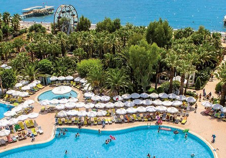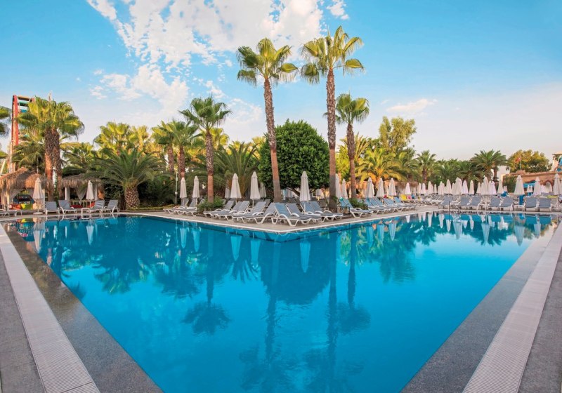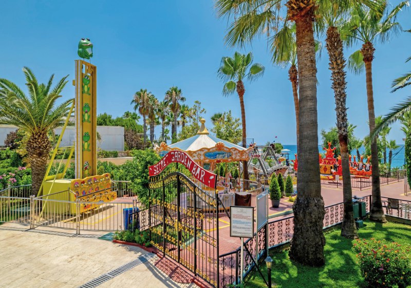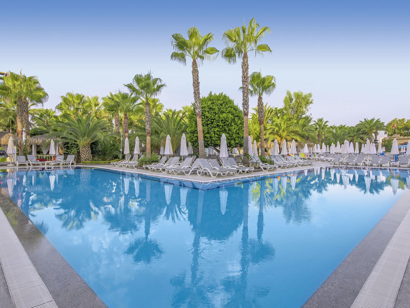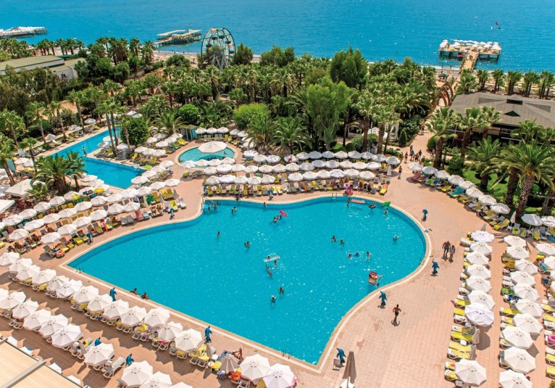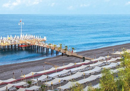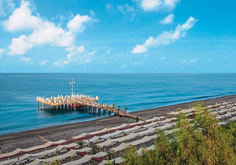Ihr wohnt direkt am hoteleigenen Kies- und Sandstrand. Die Gartenanlage öffnet sich zur Küste, sodass Ihr ohne Umwege zwischen Meer, Sonnenterrassen und Pools wechselt. Für Ausflüge liegen Side und Alanya jeweils etwa 35 Kilometer entfernt, der Flughafen Gazipasa rund 79 Kilometer.