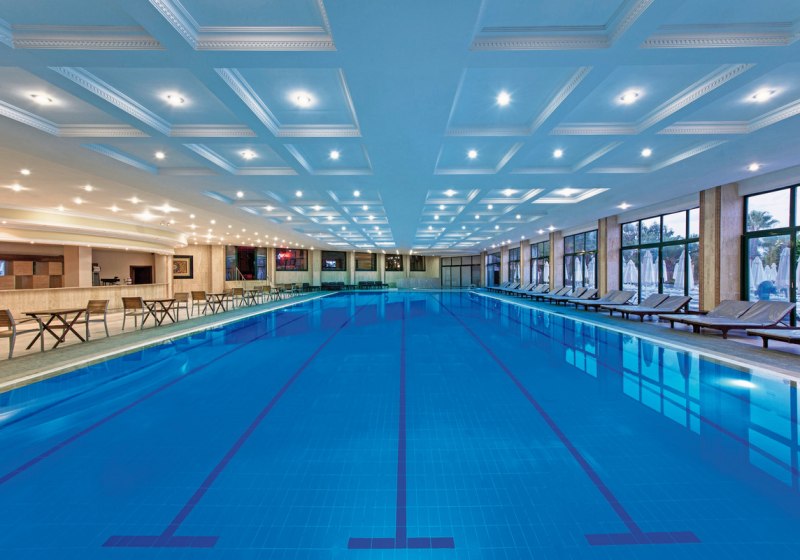• Liegestühle • Hallenbad • Außenpool • Sonnenschirme • Pool • Poolbar • Sonnenterrasse • Wasserrutsche • Wasserpark