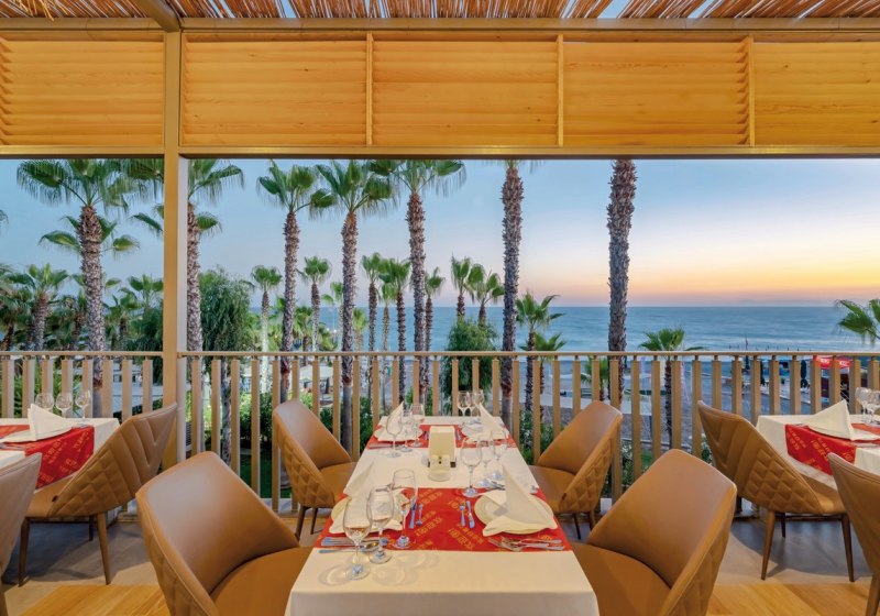 Delphin Deluxe kombiniert direkte Strandlage, grosszügige Gartenflächen und eine klare Struktur aus Pools, Relaxzonen und Aquaparks. Kulinarisch überzeugt die Mischung aus Buffet mit Terrasse und sieben À-la-carte-Optionen, ergänzt durch Bars vom Strand bis zur Lobby.