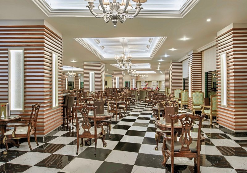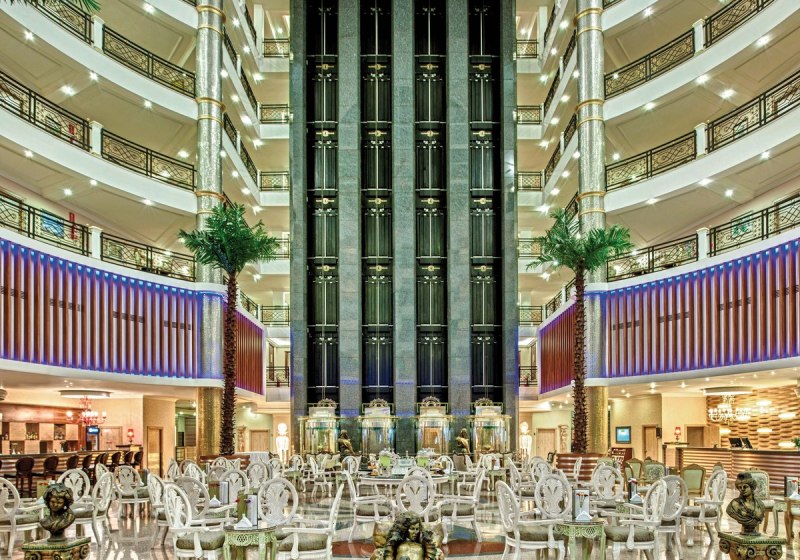 Das Hauptgebäude und Nebengebäude verbinden sich über großzügige Bereiche mit Panoramaaufzügen, Lounges und Bars. Tagsüber wechselt Ihr zwischen Poollandschaft, Strand und Terrassen; abends verlagert sich das Geschehen zu Bühne, Pianobar und Diskothek. Die Infrastruktur wirkt durchdacht, die Wege nachvollziehbar, die Angebote klar strukturiert.