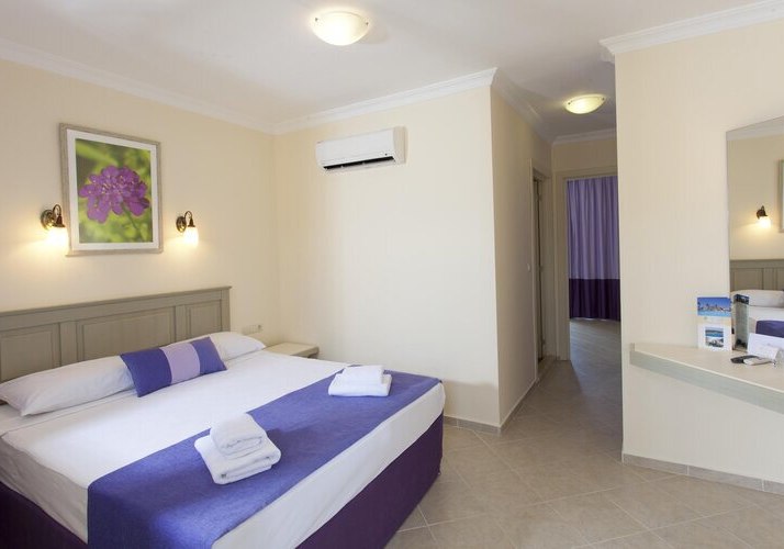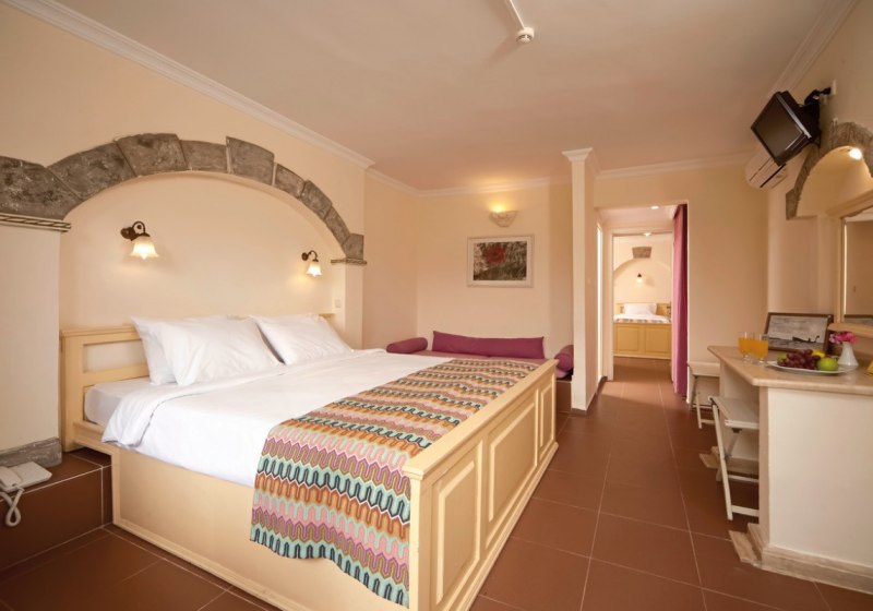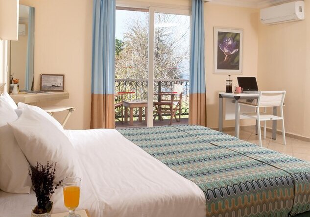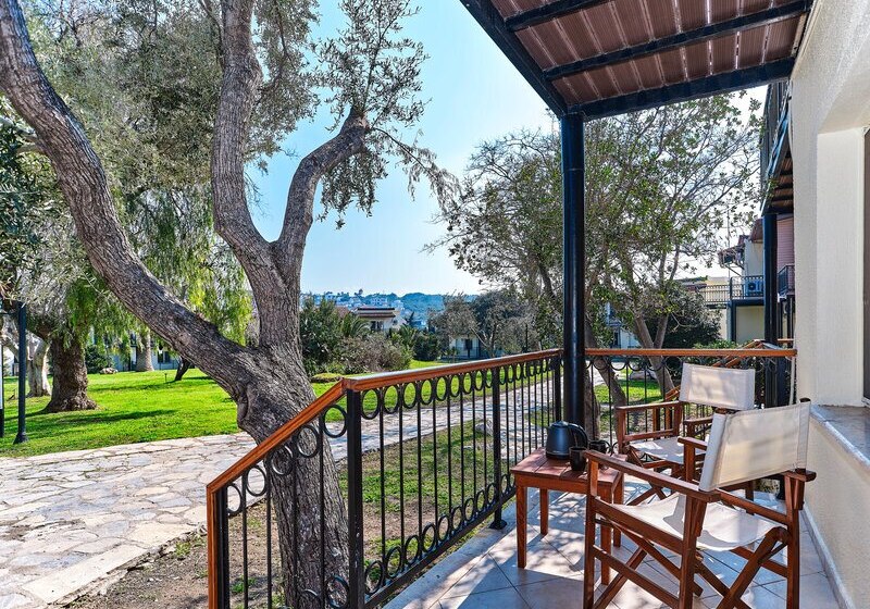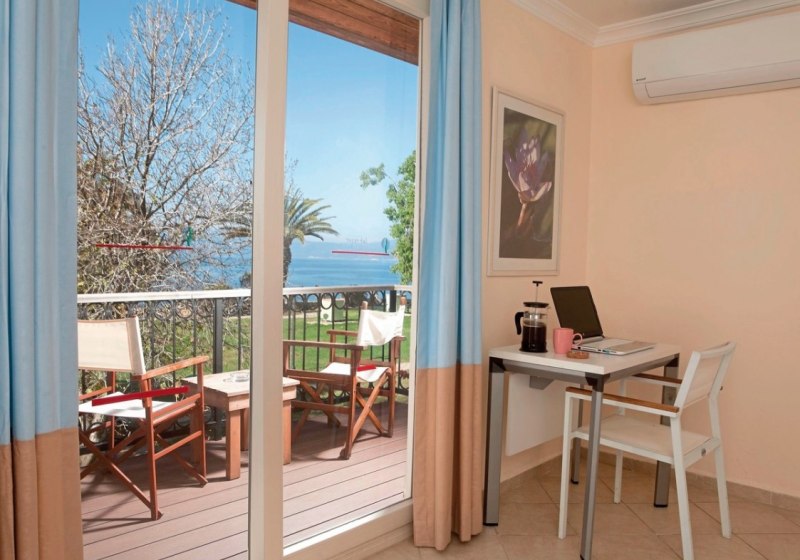 Die Zimmer bieten Dusche/WC, Föhn, Safe, Direktwahltelefon, LCD‑Sat‑TV, Fliesenboden, Balkon sowie Minikühlschrank; Klimaanlage ist individuell regulierbar. Internetzugang und WiFi sind aufgeführt, viele Einheiten bieten Meer-, Garten- oder Poolblick. Babybetten stehen auf Anfrage bereit, Nichtraucheroptionen sind umfangreich. Highlight: Superiorzimmer mit Highspeed‑Internet, Wasserkocher/Kaffeeset, Schreibtisch, Duschkabine und größerem TV.