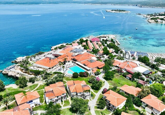 Club Resort Atlantis empfängt Euch auf einer Halbinsel direkt am flach abfallenden Sand‑/Kiesstrand – weitläufig, grün und mit klar gegliederten Bereichen für Ruhe und Aktivität. Die Bungalowanlage mit zwei- bis dreigeschossigen Einheiten wirkt wie ein kleines Feriendorf, in dem Ihr Euch schnell orientiert. Zwischen Gartenwegen, Terrassen und mehreren Pools verteilt sich das Leben angenehm; Ihr wählt zwischen Meerwasser- und Süßwasserbereichen, Familienzonen und entspannten Rückzugsplätzen. Die Atmosphäre ist lebendig, ohne zu drängen.