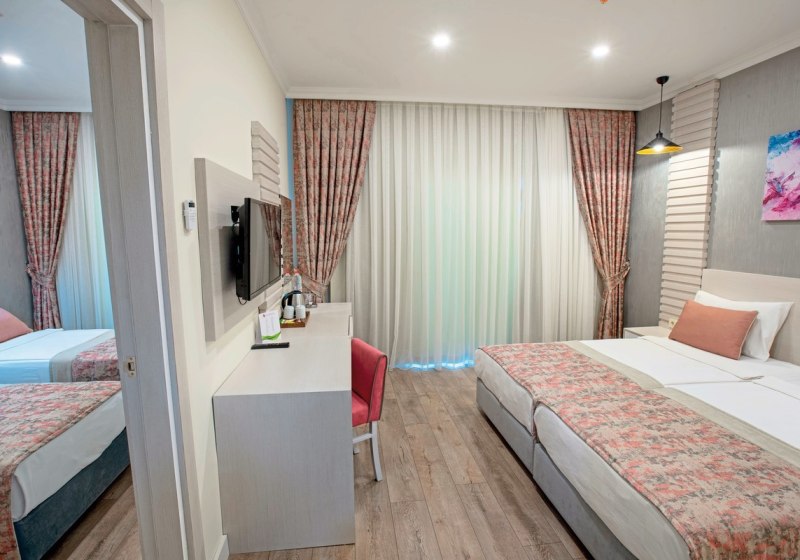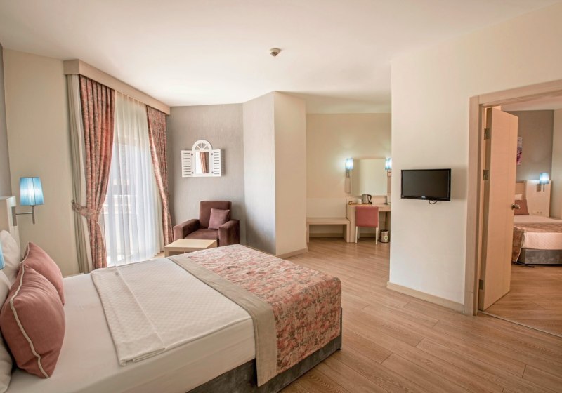 Für Familien eignen sich Zimmer mit zwei Schlafräumen und Verbindungstür, ebenfalls mit Balkon. Zusatzoptionen wie Kinder- oder Zustellbett sind vorgesehen. Die Ausrichtung auf praktische Details schafft Ruhe im Ablauf, vom Morgenritual bis zur abendlichen Rückkehr nach Pool, Strand oder Show.