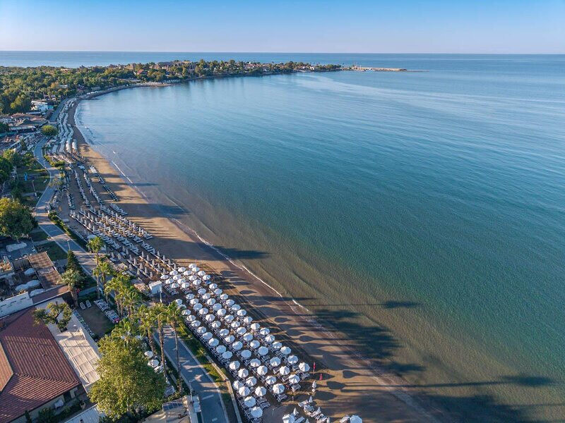 Ihr erreicht den flach abfallenden Sandstrand nach rund 200 Metern – ideal für kurze Wege mit der Beachtasche. Bis ins Ortszentrum von Side sind es etwa 1,5 Kilometer, Minibusse und Taxis verkehren in der Nähe. So kombiniert Ihr Strandnähe mit unkomplizierter Anbindung an Geschäfte, Restaurants und antike Kulissen der Umgebung.