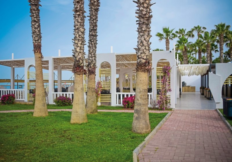 Ihr startet entspannt auf der Sonnenterrasse, wechselt zur Poolbar, später auf die Restaurantterrasse – die Wege sind kurz, die Atmosphäre angenehm belebt. Der hoteleigene Sandstrand liegt etwa 400 Meter entfernt, per Shuttle oder kurzer Spaziergang bequem erreichbar. Abends füllt sich der Theatersaal, Live-Musik setzt Akzente, während Ihr auf der Terrasse den warmen Abend ausklingen lasst.