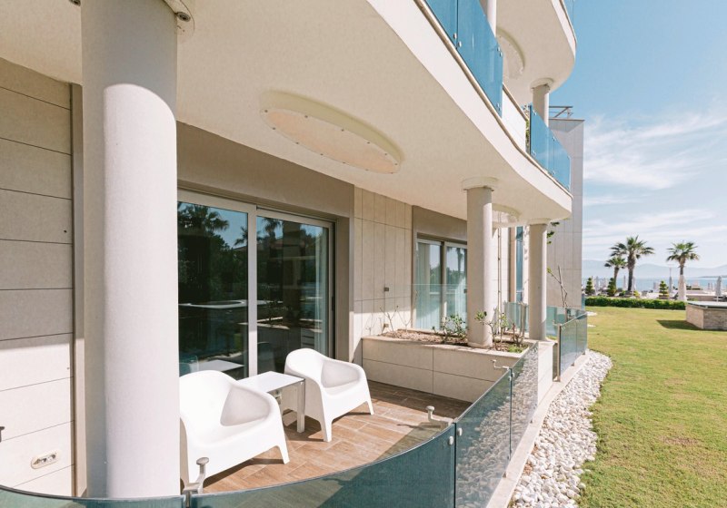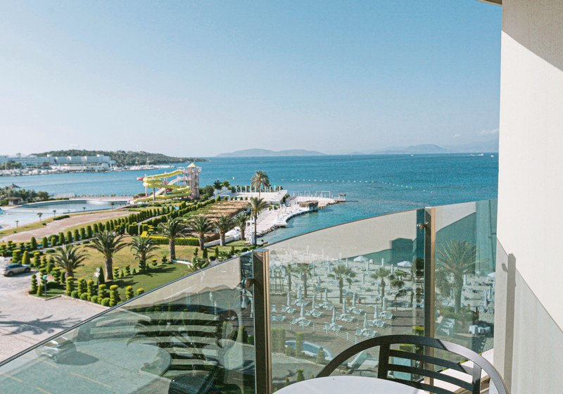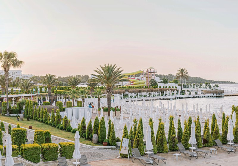 Das Resort liegt in Ilica bei Çeşme und schließt direkt an den Sandstrand an. Dieses Setting prägt die Tage: kurzer Weg vom Zimmer zur Strandliege, vom Meer zurück auf die Terrasse des Hauptrestaurants. Die Nähe zu Çeşme bringt urbane Abwechslung und Ausflusspotenzial, ohne die Ruhe der Strandlage zu beeinträchtigen. Das Gelände selbst wirkt wie eine kleine Insel mit eigenem Rhythmus: Strandzugang, Gartenflächen und Sonnenterrassen sind so organisiert, dass Ihr leicht zwischen Wasser, Schatten und lebendigen Bereichen wechselt. Liegestühle und Sonnenschirme sind am Strand vorhanden, dazu eine Strandbar, die kurze Pausen unkompliziert macht. Wer mobil bleiben will, nutzt Mietwagen- oder Transferservice sowie den hoteleigenen Shuttleservice. So bleibt Ihr flexibel, ob Ihr das Flair von Ilica auskostet oder nach Çeşme hinüberwechselt. Dank mehrsprachigem Personal funktionieren Absprachen reibungslos – hilfreich für Tagesplanungen und kleine Abstecher zwischendurch.