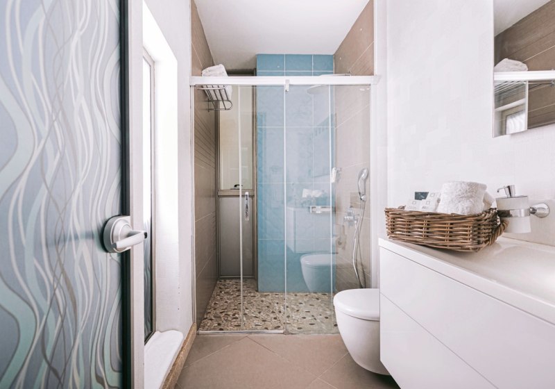 • Badezimmer Dusche, WC, Bademantel, Badeslipper, Haartrockner