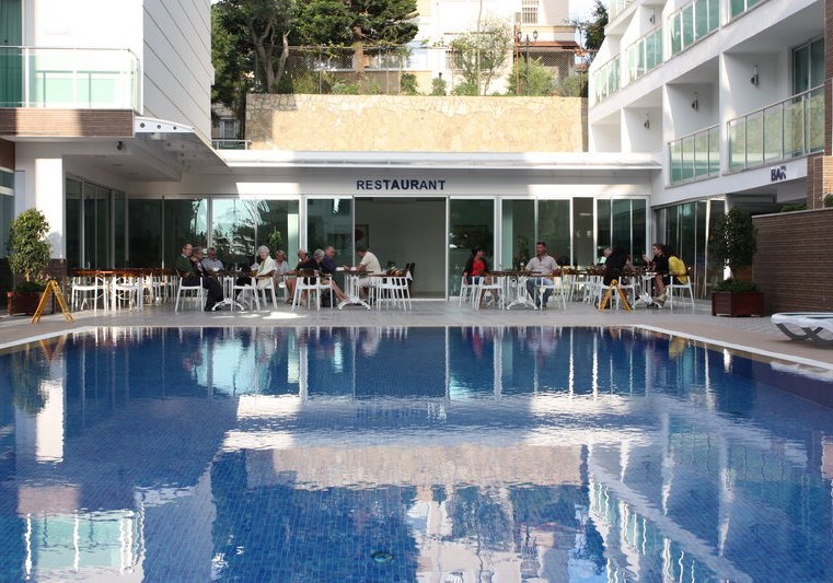 Die öffentlichen Bereiche sind funktional und kompakt angelegt: Lobby mit WLAN, TV-Raum, Terrasse und der Außenpool mit Sonnenterrasse als Mittelpunkt. Die Rezeption ist 24 Stunden besetzt, ein Aufzug verbindet die Etagen. Nützliche Services wie Wäscheservice, Wechselstube, Mietwagenverleih und Weckdienst runden das Gesamtbild ab.