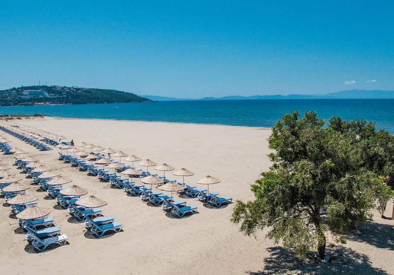 Die Lage ist präzise definiert: direkt am feinsandigen, flach abfallenden Strand von Pamucak, mit Blick und Zugang zum Meer. Bis ins Zentrum von Kusadasi sind es etwa 15 km; öffentliche Minibusverbindungen erleichtern Euch den Transfer zu Stadt, Restaurants und Einkaufsmöglichkeiten. Der Flughafen Izmir (ADB) liegt rund 60 km entfernt. Am Strand profitiert Ihr von Liegen, Sonnenschirmen, Umkleiden, Strandbar und Pavillons. So kombiniert Ihr Strandtage, kurze Wege und spontane Ausflüge in die lebhafte Hafenstadt. Für Kultur- und Shoppingtouren eignet sich die Distanz ebenso wie für entspannte Rückkehr in eine ruhige Strandkulisse. Highlight: Direkte Strandlage mit Infrastruktur – bequem zwischen Meer, Bar und Zimmer wechseln.