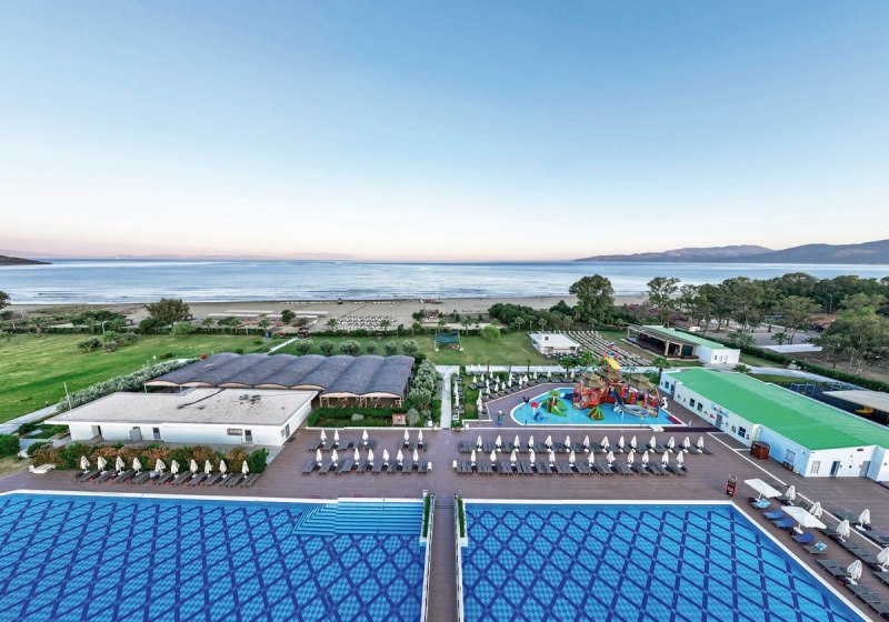 Korumar Ephesus Beach & Spa Resort kombiniert direkte Strandlage, klare Strukturen und breite Angebote: All-Inclusive mit Spezialkost, starke Bewertungen, familienfreundliche Rutschen und Miniclub, dazu Sport von Tennis bis Wassersport. Die Zimmerauswahl reicht von Swim-up bis Suite – passend für Paare und Familien.