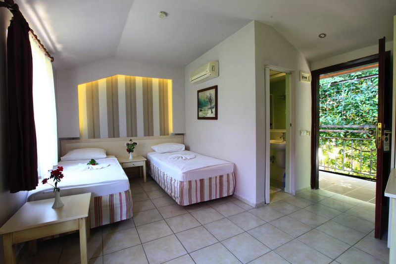 Ihr wohnt in 63 Einheiten, verteilt auf Hotelzimmer und 22 Bungalows. Die Zimmer sind funktional mit Fliesenboden, Balkon oder Terrasse und – je nach Einheit – Gartenblick ausgestattet. Dusche/WC, Föhn, Sat-TV, Direktwahltelefon, Minibar, Mietsafe sowie individuell regulierbare Klimaanlage (gegen Gebühr) gehören zur Grundausstattung. WLAN/Internet ist verfügbar. Highlight: Balkon oder Terrasse für eine private Draußen-Ecke.