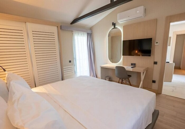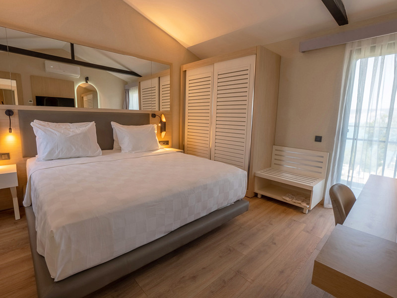 Die Zimmer setzen auf klare Linien und funktionale Details: Klimaanlage, Dusche/WC, Föhn, Safe, Minibar und LCD-Sat-TV mit MusikkanaI sind Standard. Böden aus Laminat und Fliesen sorgen für robuste Frische. Klassische Doppelzimmer verfügen über einen Balkon zur Gartenseite. Einige Wohneinheiten bieten Meerblick, was besonders in den Abendstunden überzeugt.