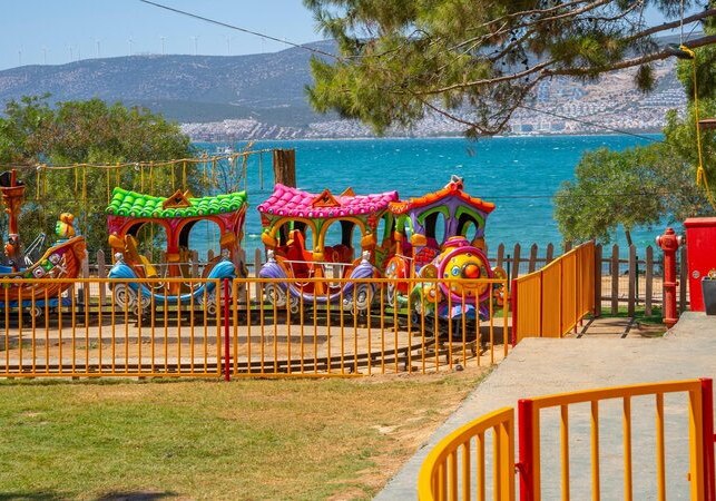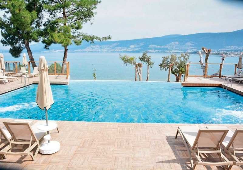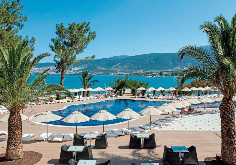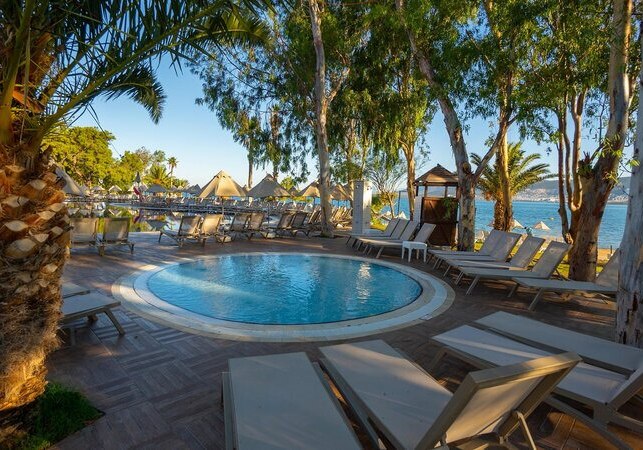 Ihr residiert in Akbük in der Türkei, direkt am hoteleigenen Sand-/Kiesstrand. Das Zentrum von Akbük erreicht Ihr nach rund einem Kilometer, Didim liegt etwa 15 Kilometer entfernt. Damit verbindet Ihr ruhige Strandlage mit kurzer Distanz zu Orten für kleine Besorgungen, einen Bummel oder einen Abstecher in die Region. Die Umgebung wirkt entspannt, das Areal ist klar abgegrenzt und bietet kurze Wege zwischen Unterkunft, Pool und Meer.