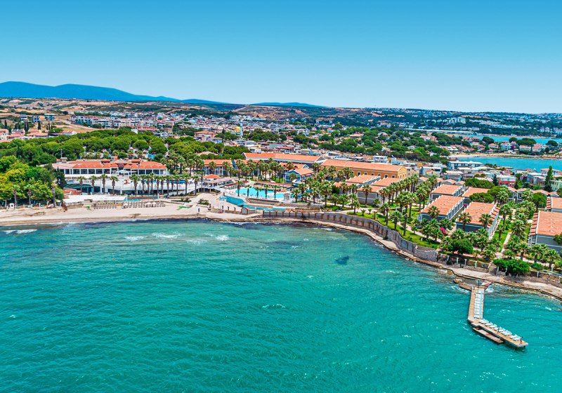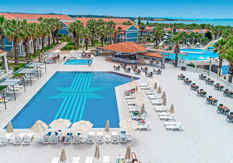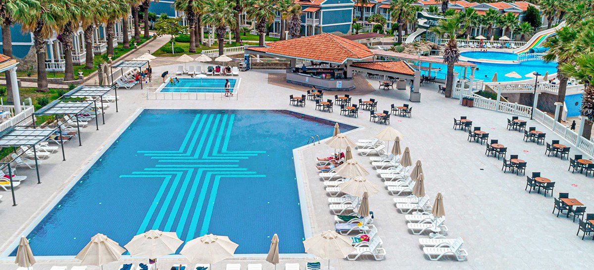 Lucas Didim empfängt Euch direkt am Strand von Didim, mit feinem Kies im Sandgemisch und einem hoteleigenen Abschnitt für kurze Wege ins Wasser. Die Atmosphäre ist lebendig und übersichtlich zugleich: zwei Pools, davon einer mit Rutschen, ein strukturierter Außenbereich mit Gartenflächen und Terrassen sowie klare Wege zwischen Strand, Restaurants und Freizeitbereichen. Familien fühlen sich mit Miniclub, Kinderpool und Spielplatz gut aufgehoben, während Ihr am Abend Shows, Theater und Livemusik erlebt.