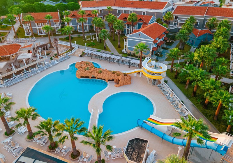 Die öffentlichen Bereiche sind klar gegliedert: Gartenflächen, Sonnenterrassen, Poolzonen und direkte Strandzugänge. Zwei Swimmingpools – einer mit Rutschen – bilden den lebhaften Mittelpunkt, Liegestühle, Sonnenschirme und Badetücher sind organisiert verfügbar. Ein Wasserpark ergänzt den Spaßfaktor und bietet Abwechslung zum Meer.