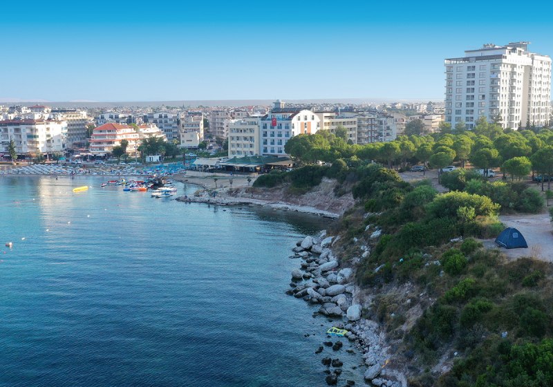 Ihr logiert im Feriengebiet Altinkum bei Didim, mit hoteleigenem Strandabschnitt in wenigen Gehminuten. Das Zentrum von Didim liegt etwa 1 km entfernt, die Lage wirkt dadurch angenehm angebunden und dennoch strandnah. Zum Meer sind es rund 100 m, Liegen und Schirme stehen am Strand und am Pool bereit.
