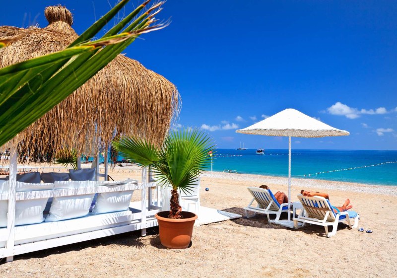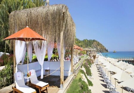 Die Lage direkt am Sand- und Kiesstrand von Tekirova bestimmt den Tagesrhythmus: kurze Wege zum Meer, ein Badesteg für den bequemen Einstieg und Liegen mit Sonnenschirmen sowohl am Strand als auch an den Pools. Der Ortskern von Tekirova ist etwa ein Kilometer entfernt, das Zentrum von Kemer rund 17 Kilometer. Öffentliche Minibusse halten direkt vor dem Hotel, wodurch Ihr flexibel bleibt.