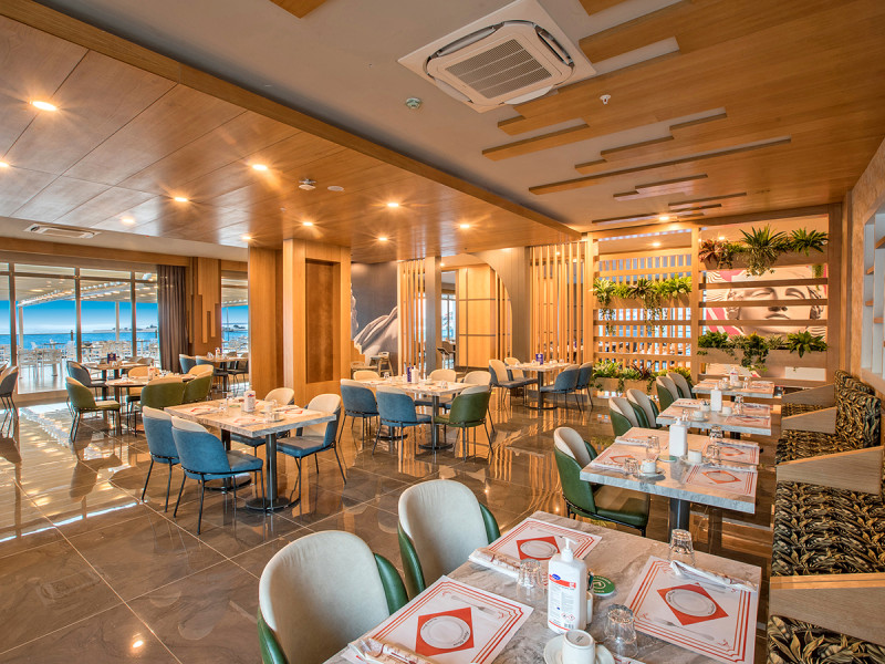 - Terrassenbuffet: Hauptrestaurant mit Terrasse verbindet Vielfalt und angenehmes Draußen-Gefühl.