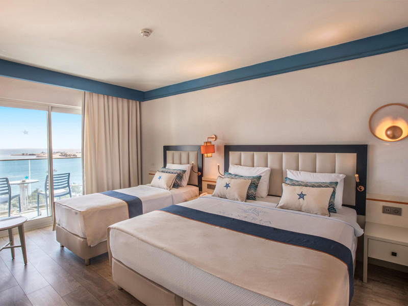 Ihr wohnt in klimatisierten Zimmern mit Balkon, Dusche/WC und Föhn, ergänzt um Safe, Minibar und LCD‑Sat‑TV. Die Böden in Laminat und Fliese vermitteln ein aufgeräumtes Raumgefühl. Für den Blick wählt Ihr seitlichen Meerblick oder volle Meerseite, je nach Wunsch und Tageslichtlust.