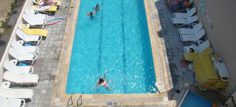Nazar Otel verbindet Strandnähe mit unkomplizierter Stadterreichbarkeit. Ihr wohnt in einem kompakten Haus mit 72 Zimmern und klarer Struktur: vier Etagen, eine lebendige Lobby, kurze Wege. Der Außenpool mit separatem Kinderbecken bildet den Mittelpunkt, Sonnenliegen und Schirme warten am Pool und am nahen Sand‑/Kiesstrand.