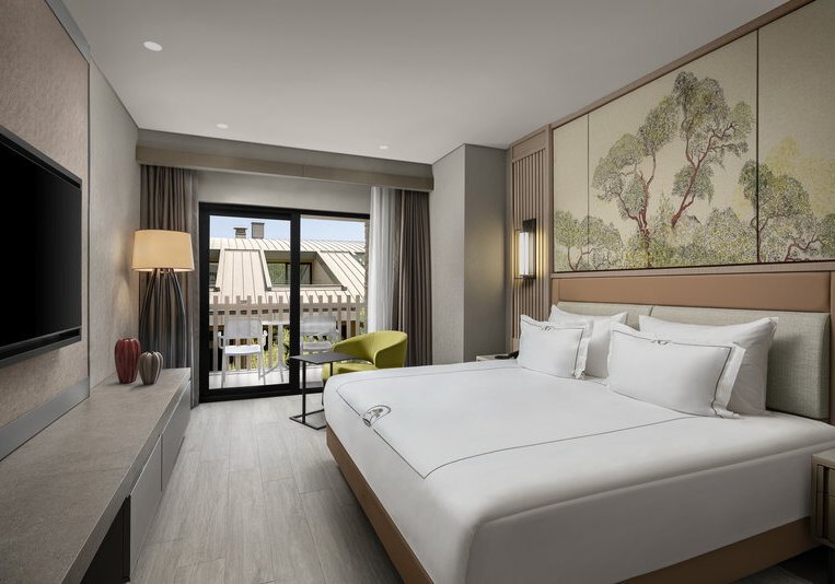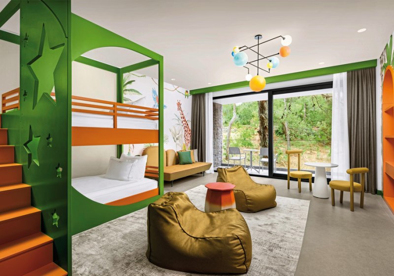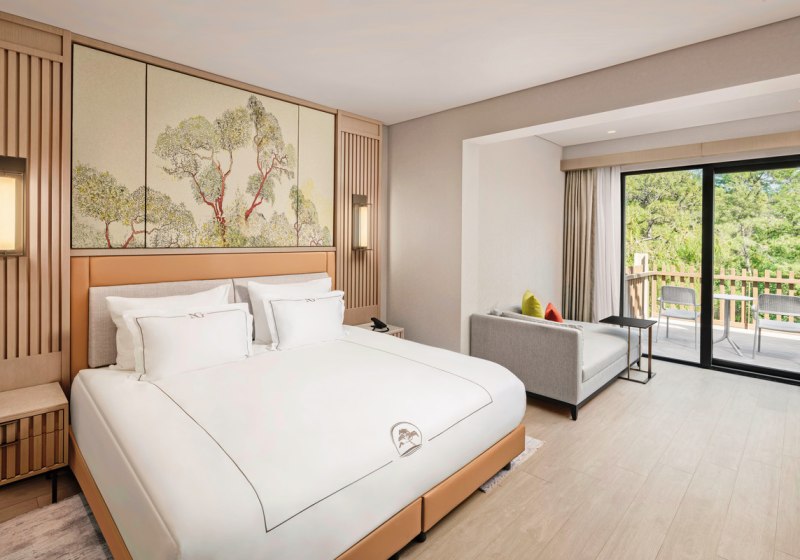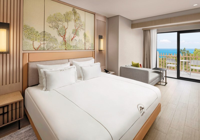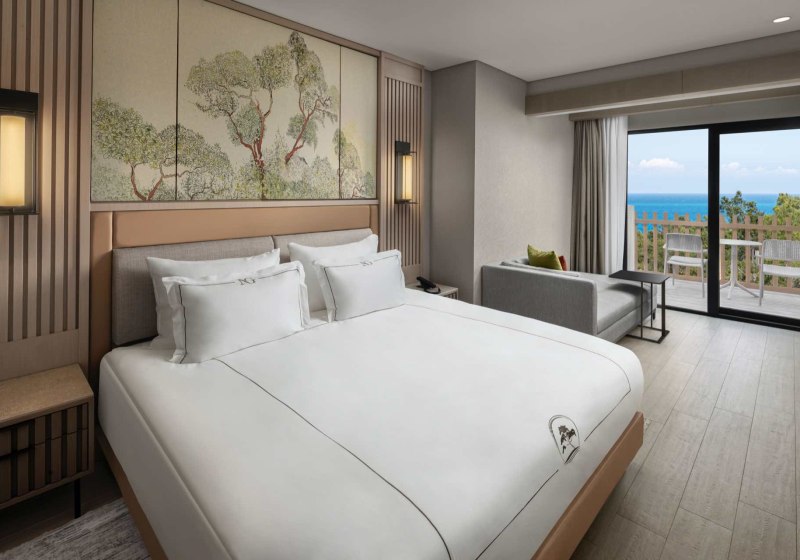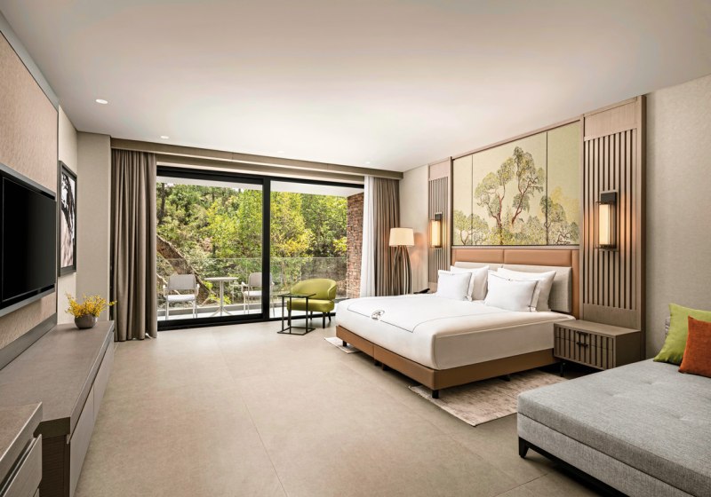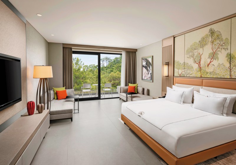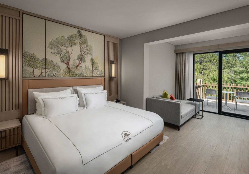 Eure Zimmer sind mit IP-TV, Safe, Minibar, Keramikboden, Balkon und zentral-individuell regelbarer Klimaanlage (VRV) ausgestattet; Bad/WC, teils zusätzliche Dusche, Haartrockner, Pflegeset, Slipper, Bademantel und Kinderbadeset sorgen für praktische Details. Heiße Getränke bereitet Ihr im Setup zu, ausgewählte Kategorien bieten Wald- oder teilweisen Meerblick. Highlight: Familienvarianten mit zwei Räumen oder zwei Bädern schaffen klare Rückzugszonen.