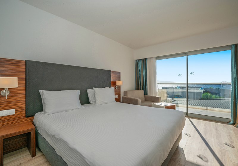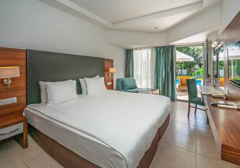 Für mehr Raum stehen Familienzimmer mit separatem Schlafzimmer sowie Zimmer mit Etagenbett bereit. Swim-up-Zimmer führen direkt zur Terrasse mit Poolzugang. Kopfkissenauswahl, Schreibtisch und Außenmöbel runden den Komfort ab – passend für Paare, Familien und Strandurlauber.